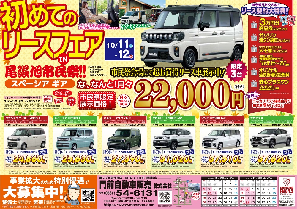 今年も市民祭の時期がやってきました(*^-^*) わが門前自動車販売も展示車をご用意して、皆様がお立ち寄りいただくのを心待ちしております☆ 尾張旭市民祭 10月11日(土)・12日(日)市民祭会場にて超お得リース車展示します! スペーシアギア HYBRID XZフロアマット、ドアバイザー付き(頭金なし)月々22,000円(限定3台)安くリースできるタイミングを逃さず、初めてリースをお考え方もこの機を逃さずご相談にきてください😄※天候不良等、中止の場合は当店までお越しください。 ![]() |