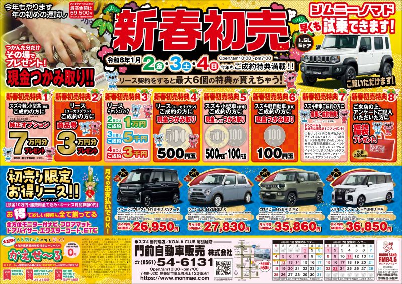 🎍あけましておめでとうございます🎍昨年は格別のご高配を賜り厚くお礼申しあげます。本年も社員一同、皆様によりご満足いただけるサービスをできるよう努めて参りますので 何卒よろしくお願い申し上げます。 今年も毎年恒例の初売りイベントを開催いたします😊 今年もご成約特典満載です! 期間はそして今回もスズキの新車をご成約のお客様に |